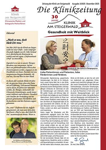 Zum Abschluss eines besonderen Jahres unserer Klinikgeschichte danke ich meinem engagierten Team für die unermüdliche Arbeit und Ihnen, liebe Patientinnen und Patienten, für Ihr Vertrauen. Mit herzlichen Grüßen und den besten Wünschen für Ihre Gesundheit,