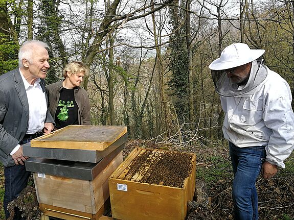 Nach langer Suche hat das Gartenteam der Klinik am Steigerwald Josef Meyer und Uli Aumüller, zusammen mit der Personalleitung Sibylle Hahner in Herrn Ernst Steinwand aus Gerolzhofen einen Imker gefunden, der bereit ist zwei Bienenvölker mit insgesamt 60.000 Bienen auf dem Klinikgelände zu betreuen.