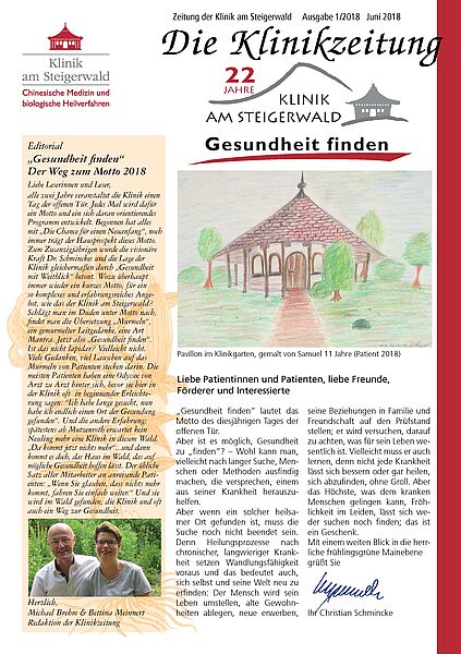 Wozu überhaupt immer wieder ein kurzes Motto, für ein so komplexes und erfahrungsreiches Angebot, wie das der Klinik am Steigerwald? Schlägt man im Duden unter Motto nach, findet man die Übersetzung „Murmeln“, ein gemurmelter Leitgedanke, eine Art Mantra. Jetzt also „Gesundheit finden“. Ist das nicht lapidar? Vielleicht nicht. Viele Gedanken, viel Lauschen auf das Murmeln von Patienten stecken darin. Die meisten „Gesundheit finden“ Der Weg zum Motto 2018 Liebe Leserinnen und Leser, alle zwei Jahre veranstaltet die Klinik einen Tag der offenen Tür. Jedes Mal wird dafür ein Motto und ein sich daran orientierendes Programm entwickelt. Begonnen hat alles mit „Die Chance für einen Neuanfang“, noch immer trägt der Hausprospekt dieses Motto. Zum Zwanzigjährigen wurde die visionäre Kraft Dr. Schminckes und die Lage der Klinik gleichermaßen durch „Gesundheit mit Weitblick“ betont. Wozu überhaupt immer wieder ein kurzes Motto, für ein so komplexes und erfahrungsreiches Angebot, wie das der Klinik am Steigerwald? Schlägt man im Duden unter Motto nach, findet man die Übersetzung „Murmeln“, ein gemurmelter Leitgedanke, eine Art Mantra. Jetzt also „Gesundheit finden“. Ist das nicht lapidar? Vielleicht nicht. Viele Gedanken, viel Lauschen auf das Murmeln von Patienten stecken darin. Die meisten Patienten haben eine Odyssee von Arzt zu Arzt hinter sich, bevor sie hier in der Klinik oft in beginnender Erleichterung sagen: “Ich habe lange gesucht, nun habe ich endlich einen Ort der Gesundung gefunden“. Und die andere Erfahrung: spätestens ab Mutzenroth erwartet kein Neuling mehr eine Klinik in diesem Wald. „Da kommt jetzt nichts mehr“...und dann kommt es doch, das Haus im Wald, das auf mögliche Gesundheit hoffen lässt. Der übliche Satz aller Mitarbeiter an anreisende Patienten: „Wenn Sie glauben, dass nichts mehr kommt, fahren Sie einfach weiter.“ Und sie wird im Wald gefunden, die Klinik und oft auch ein Weg zur Gesundheit.