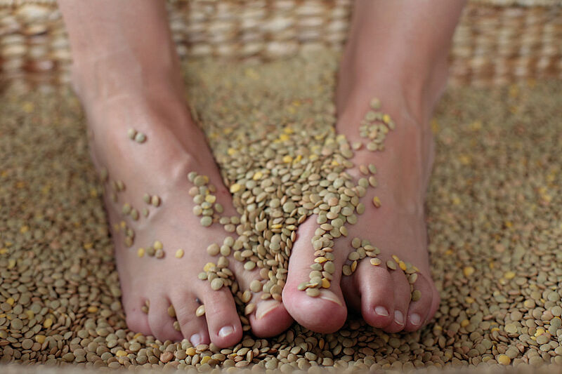 Nehmen Sie für ein Linsenbad 1,5 Kilo Linsen und schütten Sie sie in eine Schüssel. Setzen Sie sich hin und stellen Sie Ihre Füße in das Linsenbad. Konzentrieren Sie sich auf Ihre Füße und bewegen Sie ihre Zehen: anziehen, strecken und die Sohlen ein wenig auf dem Linsenboden belasten. Empfinden Sie eine größere Entlastung von der Unruhe, den Schmerzen oder der Taubheit durch Wärme, erwärmen Sie die Linsen in einem Topf im Backofen. Aber achten Sie darauf, dass die Wärme hautverträglich ist. Verspüren Sie hingegen durch Kälte an den Füßen Erleichterung, hilft es, die Linsen vorher in den Kühlschrank zu stellen.