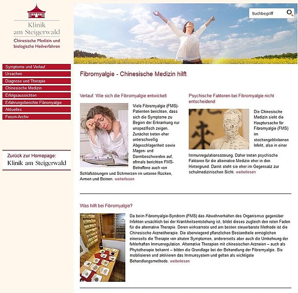 Obwohl das Krankheitsbild häufig ist, gibt es viele Rätsel auf. Eine Diagnosestellung ist schwierig und viele Ärzte stempelten Patienten zu „eingebildeten Kranken“ ab. Eine richtige medikamentöse Therapie gibt es nicht. Im Gegensatz dazu bietet die Chinesische Medizin eine gute Alternative. Einerseits durch die alternativen Therapiemethoden, andererseits aber auch indem sie wertvolle Tipps zur Lebensgestaltung betroffener Patienten gibt. Alle Informationen dazu finden Patienten nun auf der neuen Website www.fibromyalgie-tcm.de. Dort wurden Artikel über Krankheitsursachen, Verlauf, alternative Behandlungswege und Erfolgsaussichten sowie Tipps zur Selbsthilfe zusammengestellt.