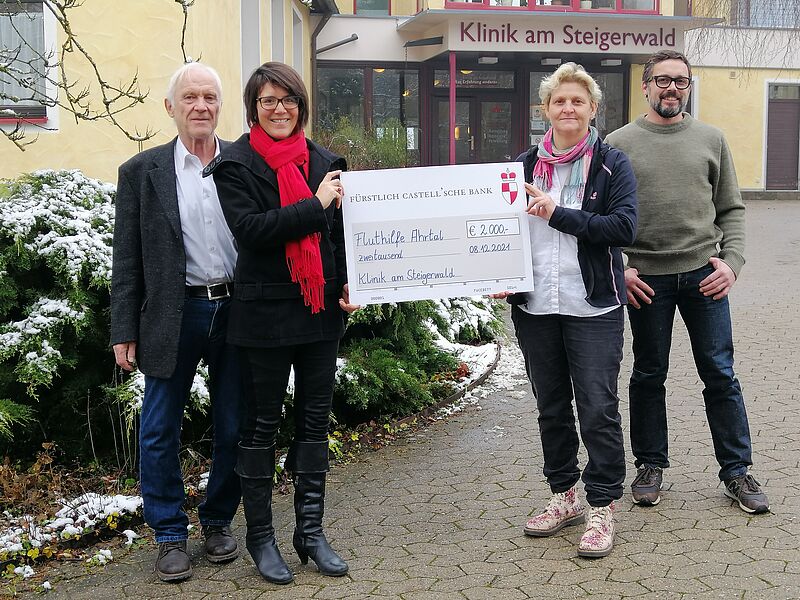 Gestern spendeten Geschäftsführung und Mitarbeiter der Klinik am Steigerwald dem Spenden-Shuttle Ahrtal 2.000 Euro