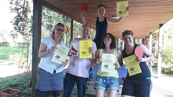Am 29.4.2018 fand ein Tischtennis-Turnier in der Klinik am Steigerwald statt. Organisiert wurde es von der Kliniklehrerin Natascha Reiter. Teilgenommen haben von links nach rechts Michaela Ludwig, Jörg Widmann, Samuel Decker, Natascha Reiter, Ja‘n Winter. Gewinner des Tuniers ist Jörg Widmann. Er bekommt als 1.Preis ein Kochbuch des Hauses. Herzlichen Glückwunsch.