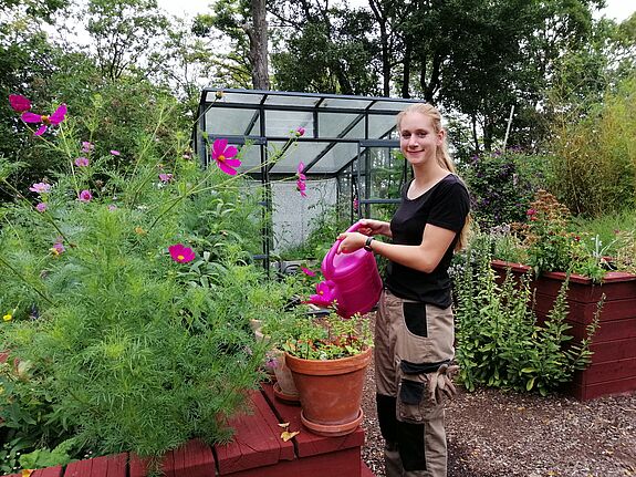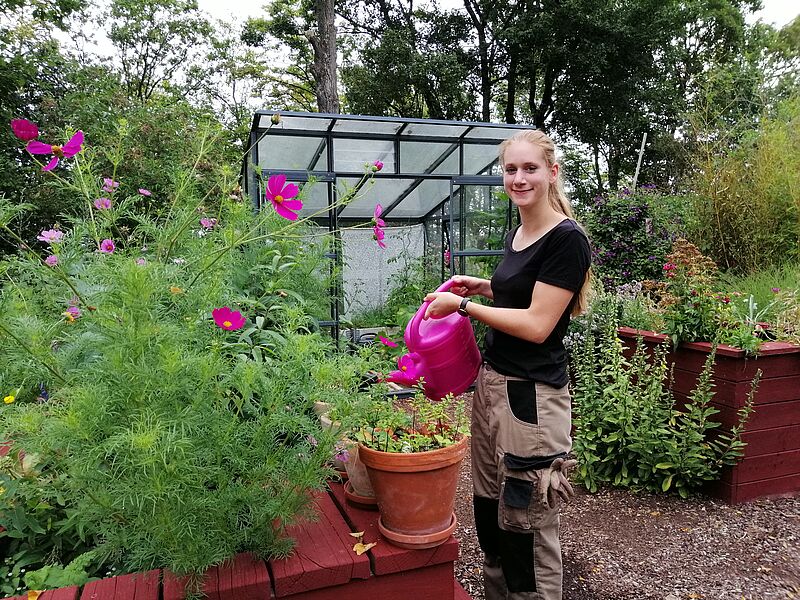 Angereist ist sie mit einem Quad, und dann hat sie Garten der Klinik am Steigerwald erobert Xenia Dünninger absolviert ein freiwiliges ökologisches Jahr in der Klinik am Steigerwald und dies im besonderen Jahr 2020, wo durch Corona alles anders ist. Aber in einem großen Garten mit zusätzlichem Nutzgarten muss auch in Coronazeiten gepflegt, versorgt, gegossen, geschnitten, gepflanzt und geerntet werden. So gab es Zeiten, als, aufgrund der Allgemeinverfügung in der Corona-Situation, noch nicht einmal Patienten da waren, dass Xenia dadurch ab und zu Alleinherrin über das große Aussenreich der Klinik am Steigerwald war und die Kollegen plötzlich augenzwinkernd von „Xenias Garten“ sprachen. Gelernt hat sie viel in diesem FÖJ und zurück gegeben hat sie uns auch sehr viel. Sie hat großartige Arbeit geleistet und hat die Gärtnerin Uli Aumüller nach Kräften unterstützt.